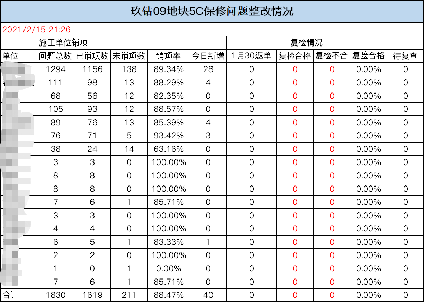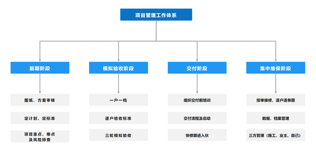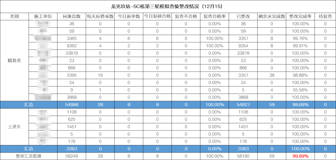 在模拟验收阶段,中途发生一些小摩擦,主要为各参建单位进度不平行,对此乐居根据现场进行三边管理,即边施工、边查验、边整改,不断调整查验及销项计划,固定专人跟进各自责任区内的施工单位。现场问题位置做好对应区域对应分类的标示,不断优化问题记录表。减少施工单位寻找问题时间,提升维修效率,增加问题关闭率。